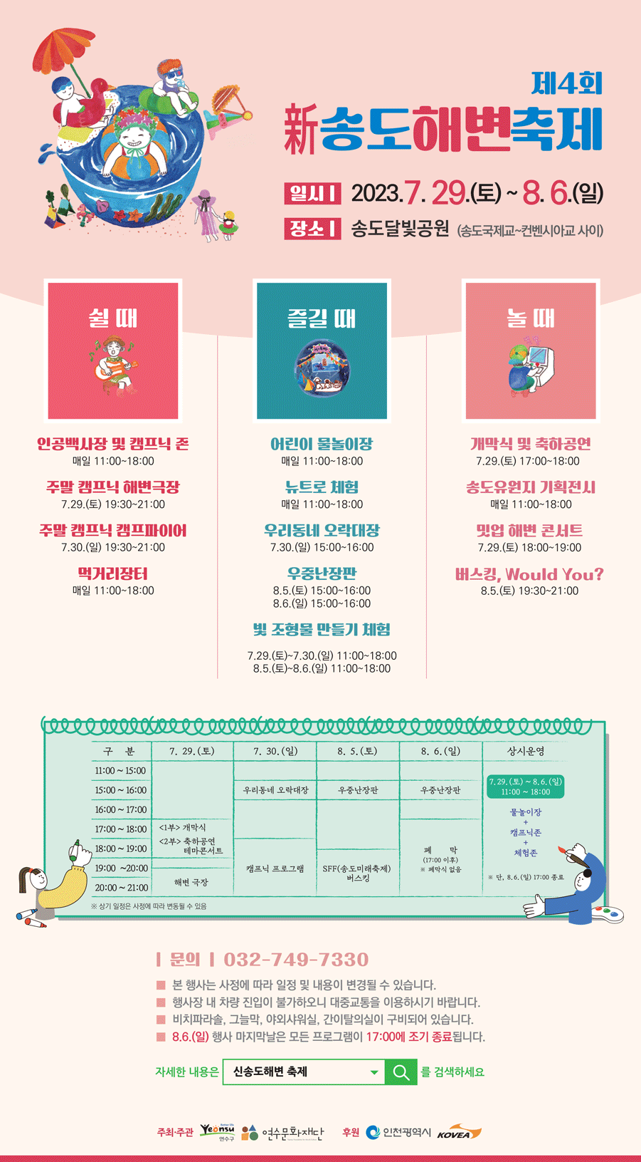 코로나 종식 이후 5년 만에 연수구의 대표축제로써 송도에서 물놀이와 함께 아름다운 도시경관을 볼 수 있는 온 가족이 여름을 즐겁게 보낼 수 있는 제4회 新송도해변축제가 다가옵니다.