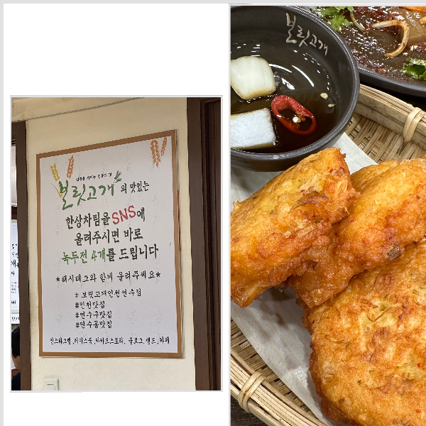 SNS에 올리면 녹두전 4개를 바로 주십니다.홀에서 드셔도 되고 배부르시면 싸달라고 요청하시면 포장해 주십니다. 남자사장님도 목소리에서 친절함이 느껴지고요. 일하시는 이모님들 모두 너무 친절하시고, 음식맛도 정말 맛있었습니다. 이제 저는 이곳 당골이 되려고요.