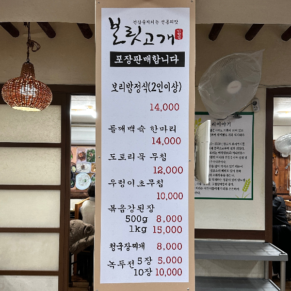 아래는 메뉴와 가격입니다. 요즘 물가가 많이 오르다 보니 저도 가성비를 많이 따지게 되는데요. 저희는 보리밥정식(2인) 시켰습니다.