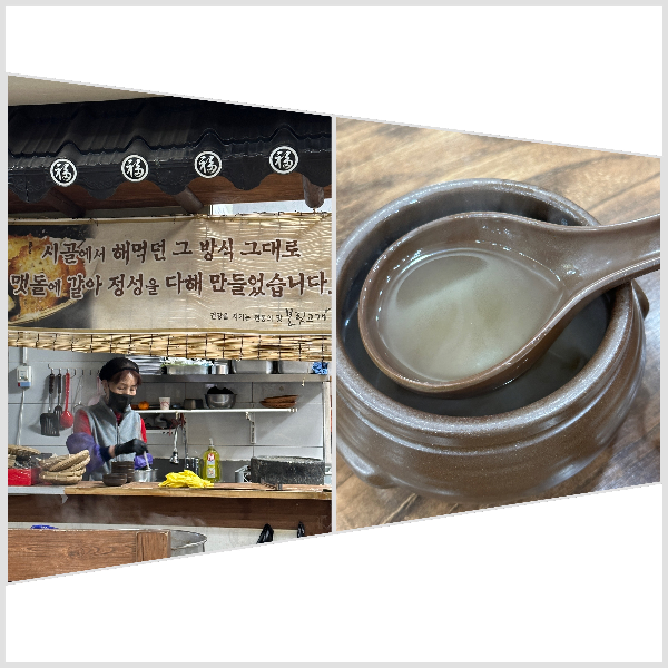 골목 사이에 있어서 주차는 살짝 불편하지만 가게 앞 말고 교회 쪽 주차장을 이용하시는 방법도 있던 것 같습니다. 식사 마치고 나올 때 주차권 발행해 줄까 물어보시더라고요. 식당에 자리를 잡고 앉았을 때 보통 물을 주시는데 날씨가 추워서 그런지 따뜻한 숭늉을 주시더라고요. 개인적으로 숭늉을 너무 좋아해서, 음식이 나오지도 않았는데 기분이 좋아지더라고요.