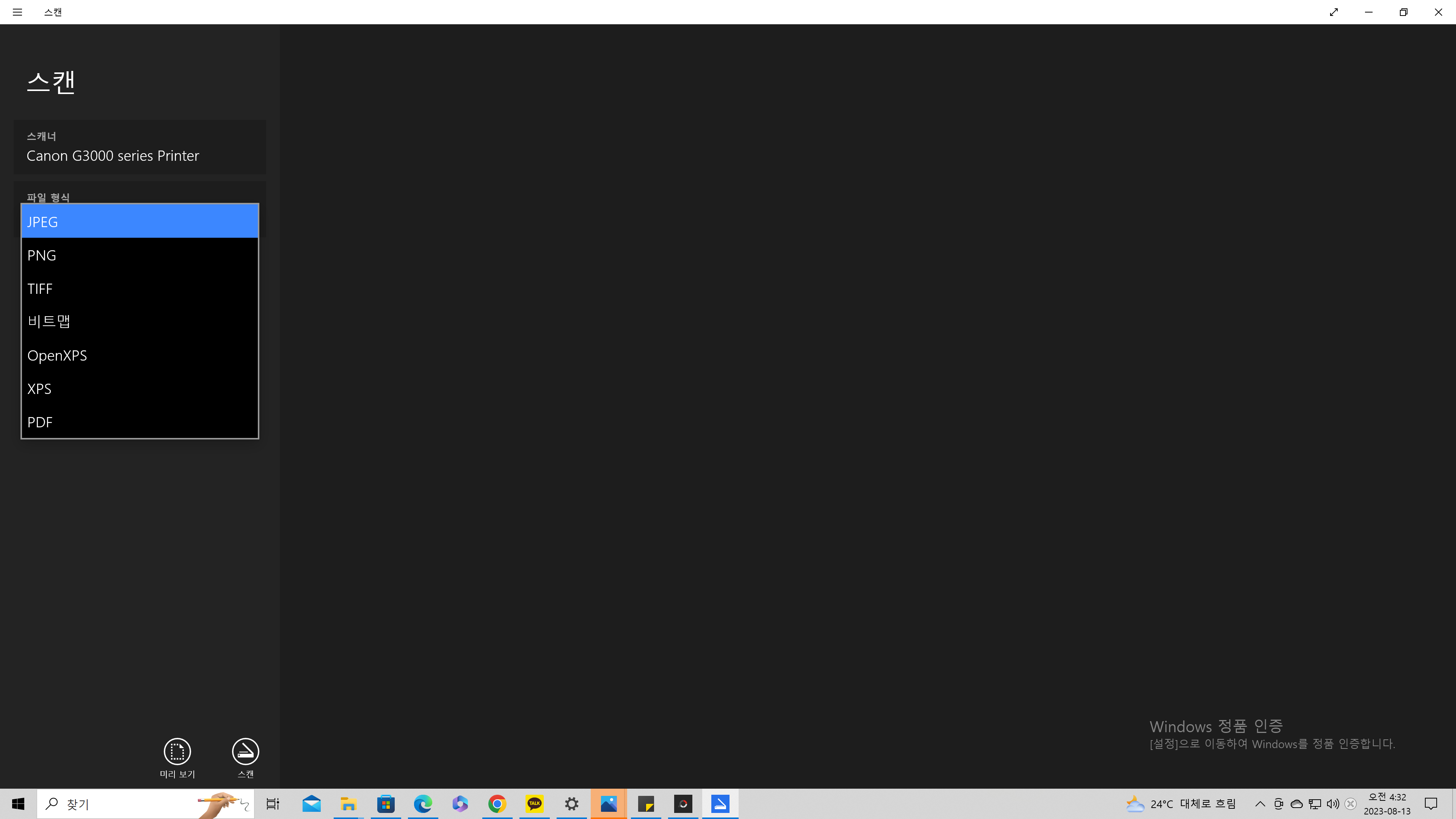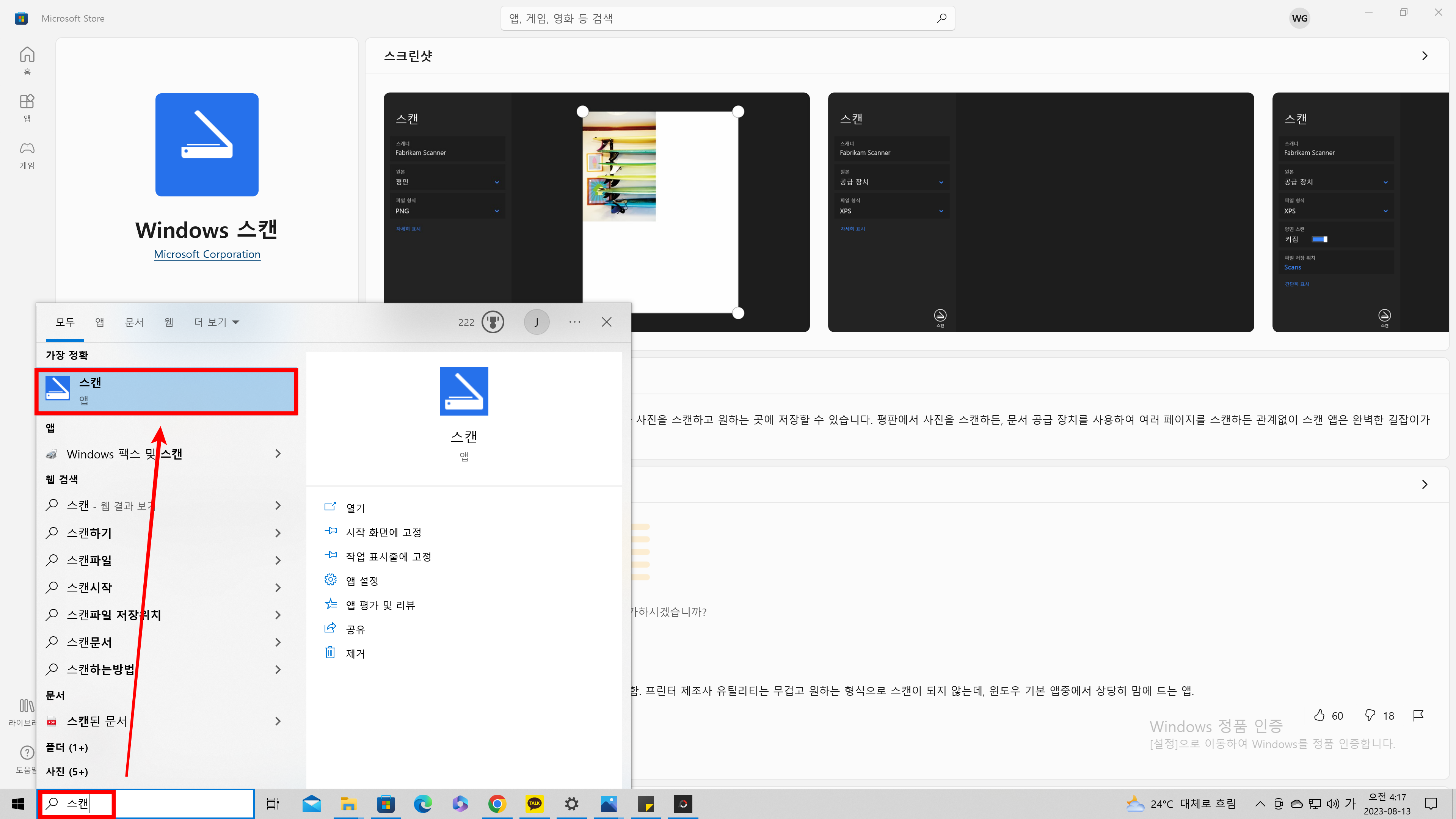 설치가 완료되었다면 검색란에 "스캔"이라고 검색하면 스캔앱이 생성되는 것을 볼 수 있습니다.