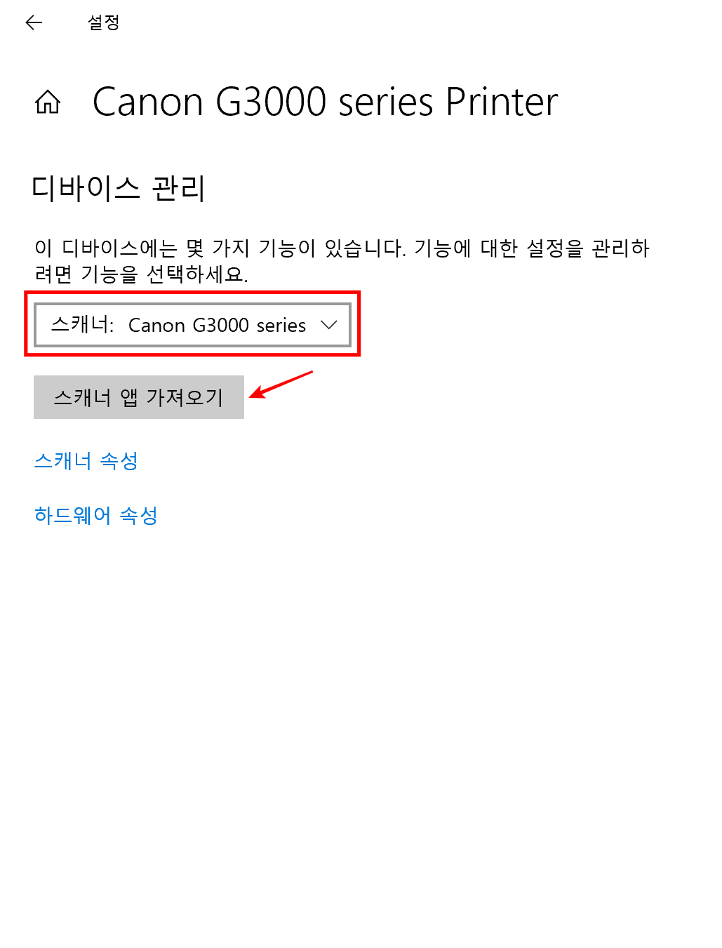 캐논 프린터 설정에서 스캐너 설정으로 변경해 준 다음에 스캐너 앱 가져오기를 눌러주세요. 그러면 스캔 앱 화면이 뜨게 되는데 설치해주시면 됩니다.