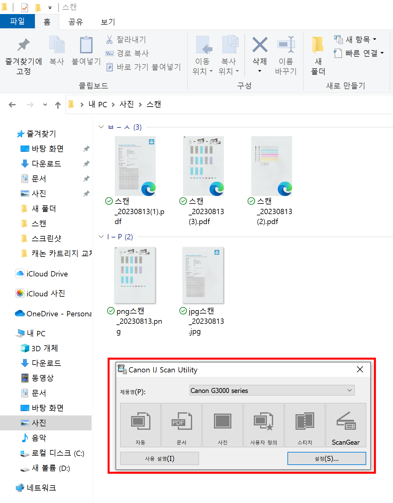 문서로 스캔을 했을 경우 스캔이 완료될 때마다 위의 문구가 뜨고 계속 스캔을 하면 PDF파일로 한 페이지에 저장이 되는 것을 확인했습니다. 물론 다른 좋은 프로그램도 있겠지만, 별도의 다운로드 없이 순기능으로만으로도 이 정도 기능을 한다는 게 간편하게 쓰기에는 좋은 거 같네요.