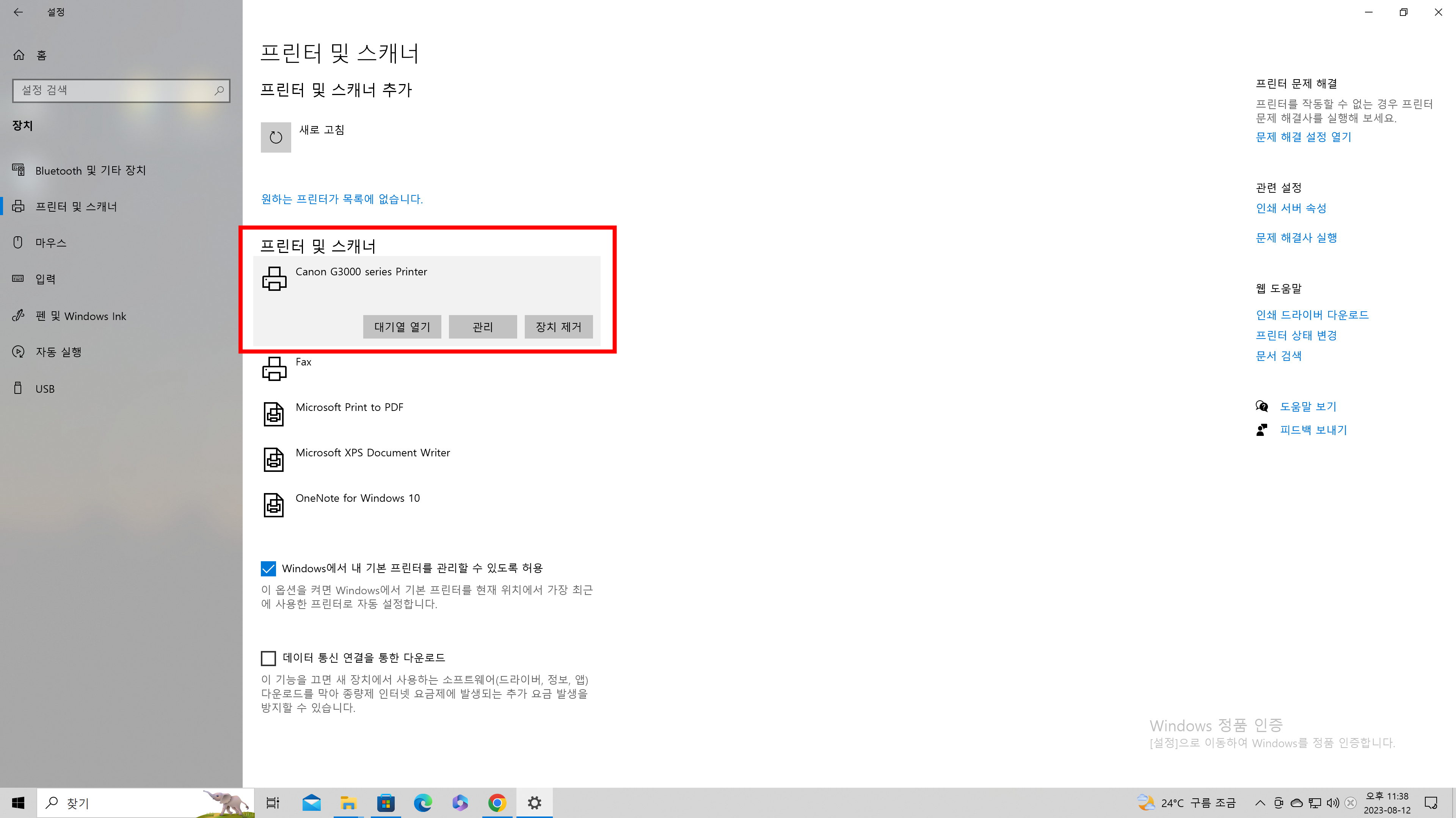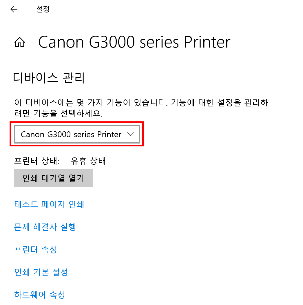 위에 이미지처럼 설정에 들어가시면 프린터 및 스캐너 "관리"에  접속을 합니다.