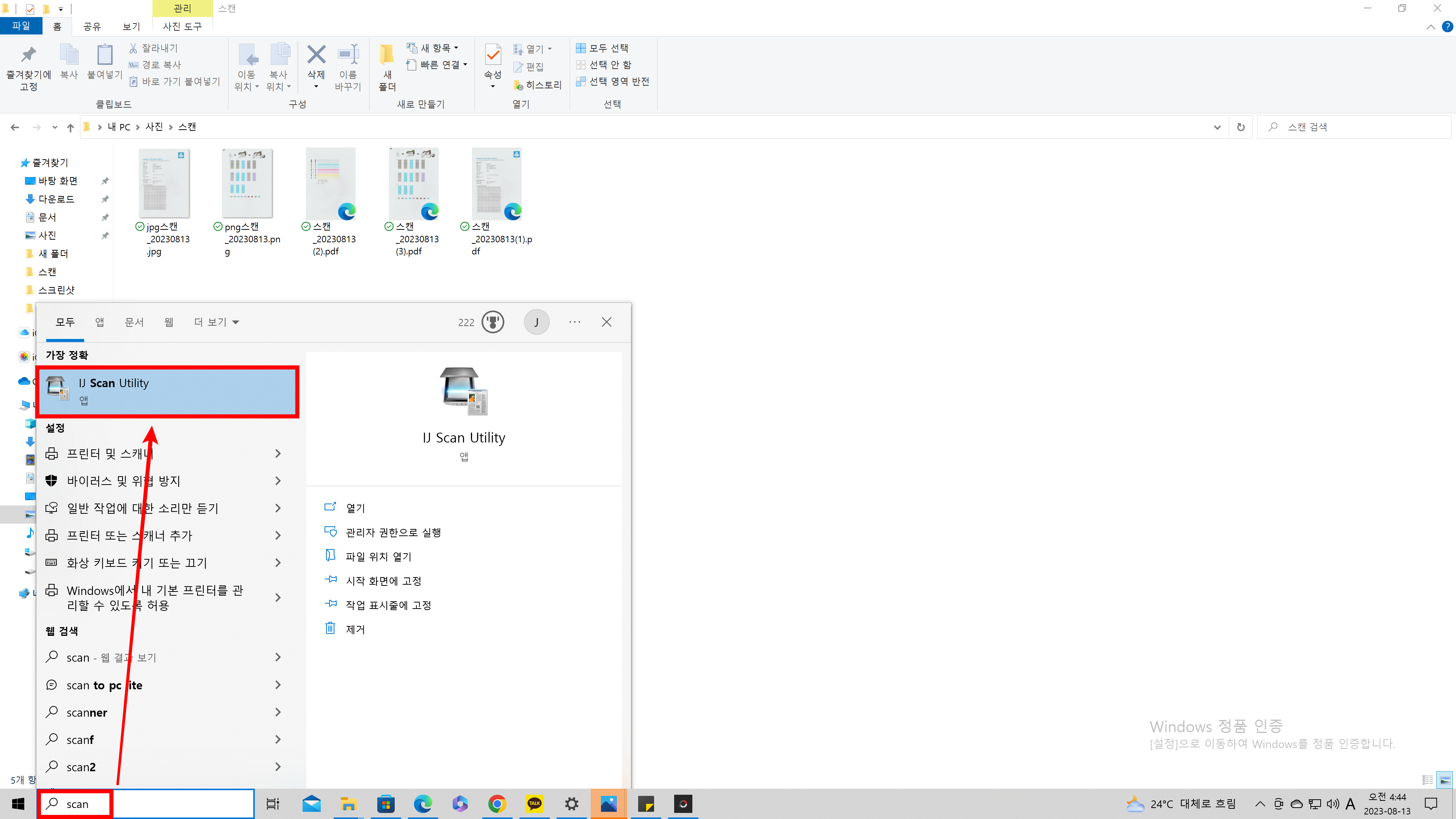 설치가 완료되었다면 검색란에 "스캔"이라고 검색하면 스캔앱이 생성되는 것을 볼 수 있습니다.