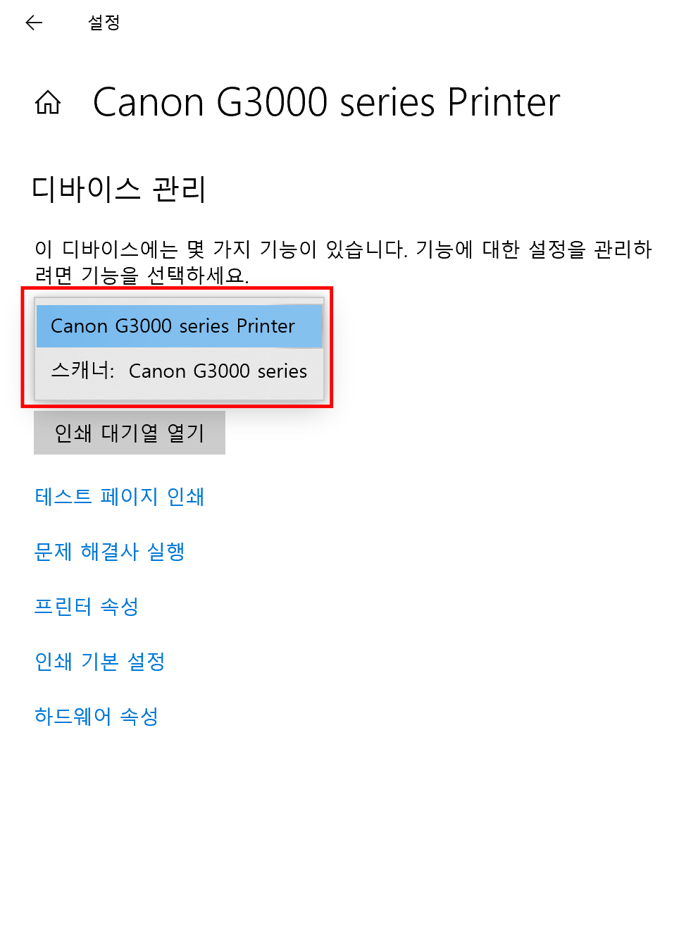 위에 이미지처럼 설정에 들어가시면 프린터 및 스캐너 "관리"에 접속을 합니다.
