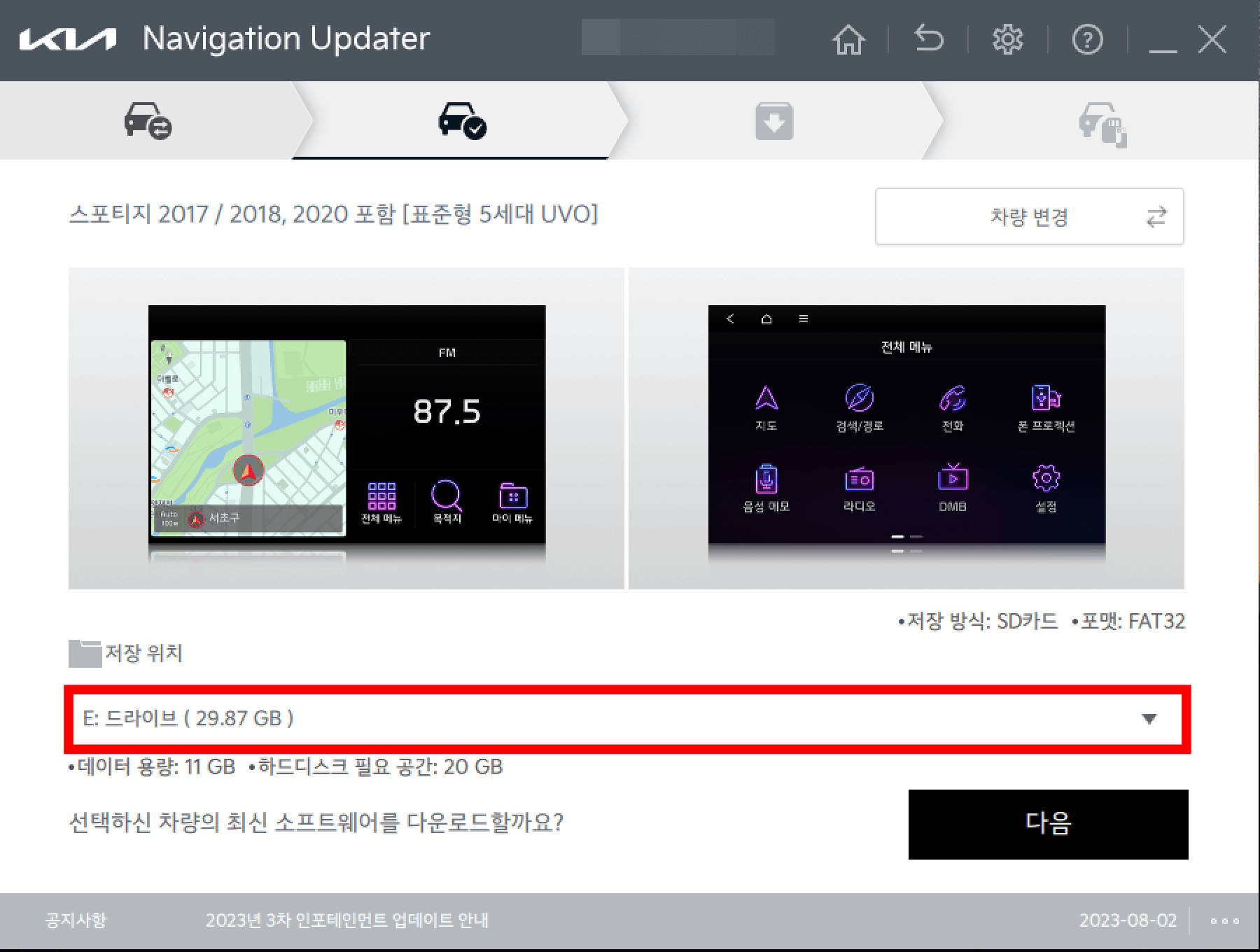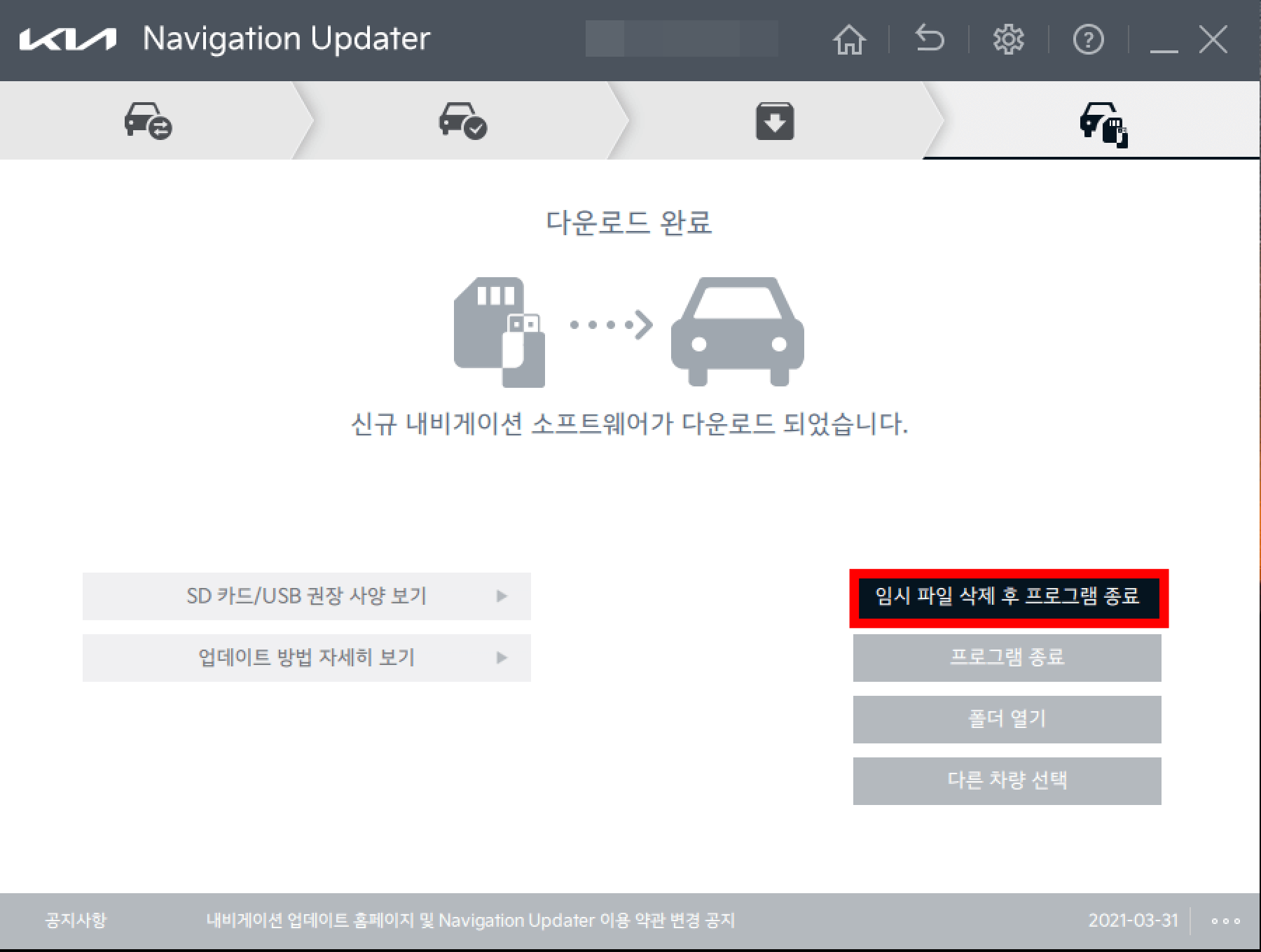 이렇게 하시면 SD카드 업데이트가 끝났습니다. 이제 마지막으로 이 SD카드를 차량에 연결시키고 업데이트 실행을 시켜주시면 끝나게 됩니다.