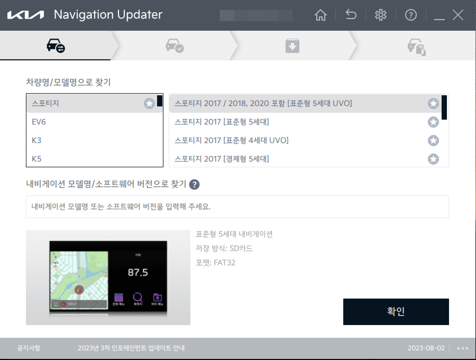 만약 내 차량이 어떤 건지 모르겠다 하시는 분은 차량 내비게이션 일반 설정에서 확인할 수 있으니까 업데이트하시기 전에 미리 알아두셨다가 업데이트할 때 '차량명/모델명으로 찾기'를 선택하셔서 본인 차량에 맞는 업데이트를 진행하시면 되겠습니다.