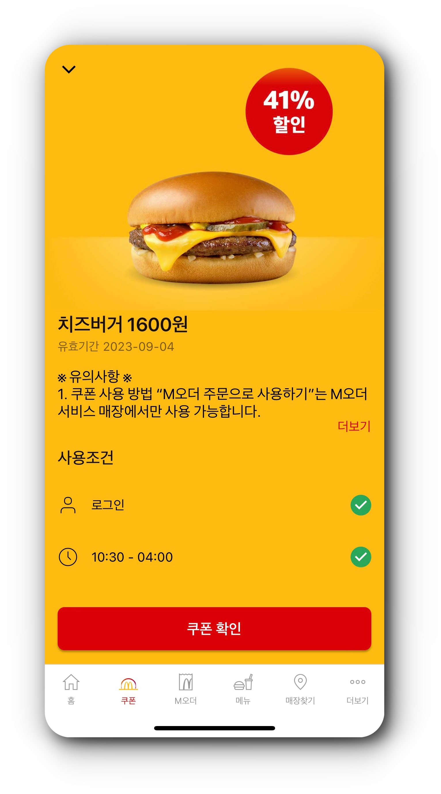 쿠폰을 확인해 보시면 단품 및 세트메뉴 할인률을 확인하시고 시간대도 확인해보시면 색깔이 진한 색은 바로 사용할 수 있는 메뉴이고 시간대가 아니라면 옅은 글씨색깔로 표시가 됩니다. 더블 불고기 버거 단품이 4500원인데 쿠폰을 적용하면 3400원으로 1100원이나 할인이 적용되는걸 보실 수 있습니다.