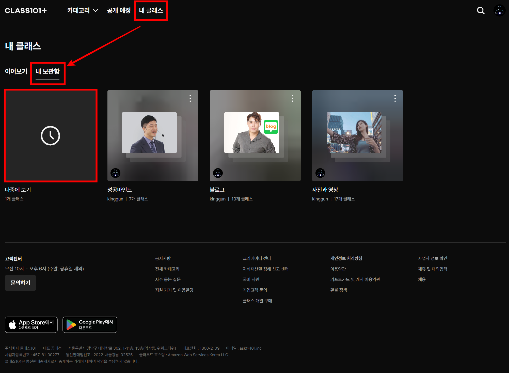 위에 이미지에 보시는 것과 같이 즐겨찾기 기능으로 빈 곳에 클릭하면 색깔이 들어가는 것을 보실 수 있습니다. 바로 즐겨찾기 추가를 했다는 뜻이에요. 이것을 확인하기 위해서는 상단의 '내 클래스'를 클릭하시고 '내 보관함'을 클릭하시면 나중에 보기 폴더에 저장이 됩니다. 예시로 주연님의 강의를 즐겨찾기 해봤습니다.