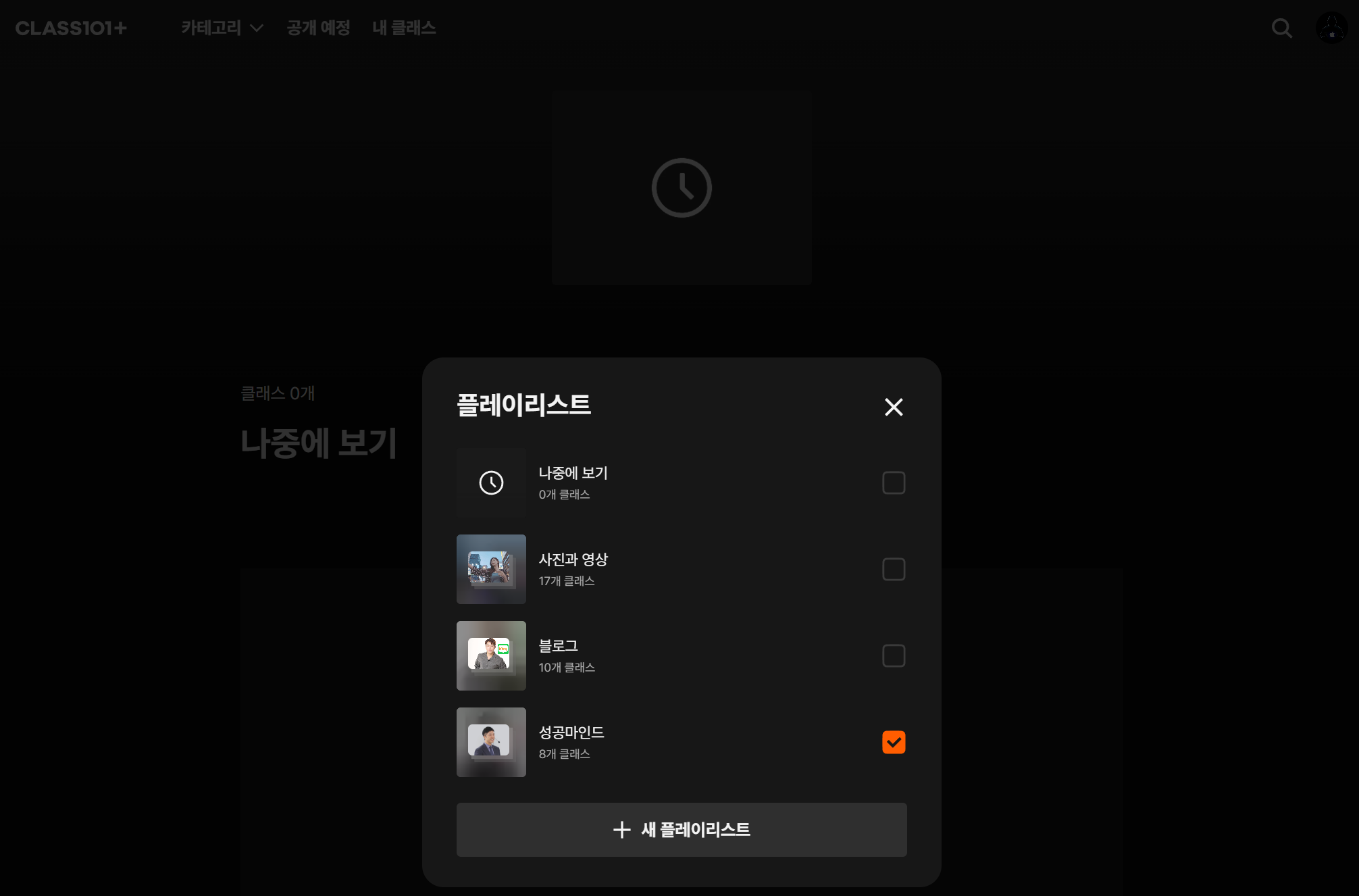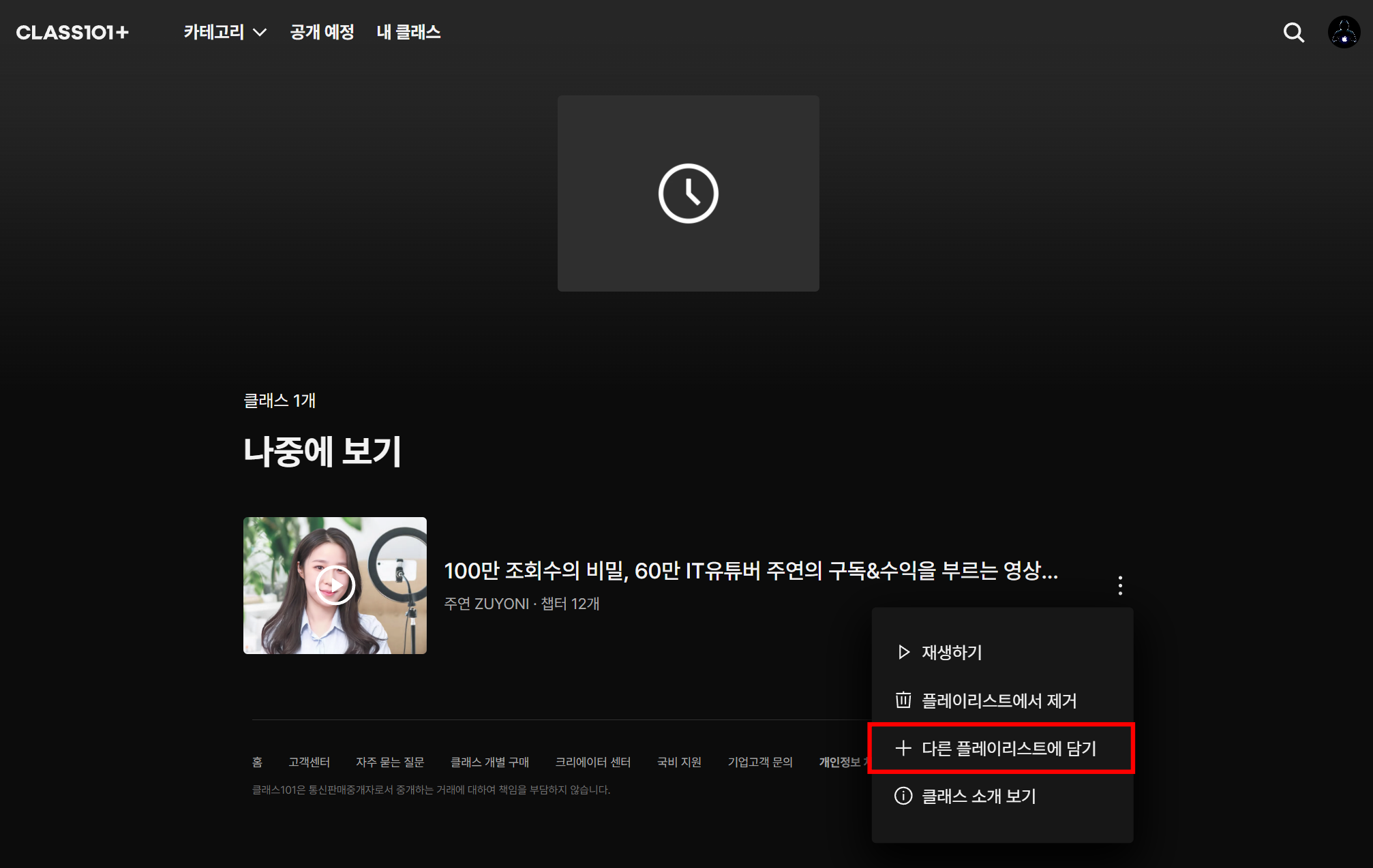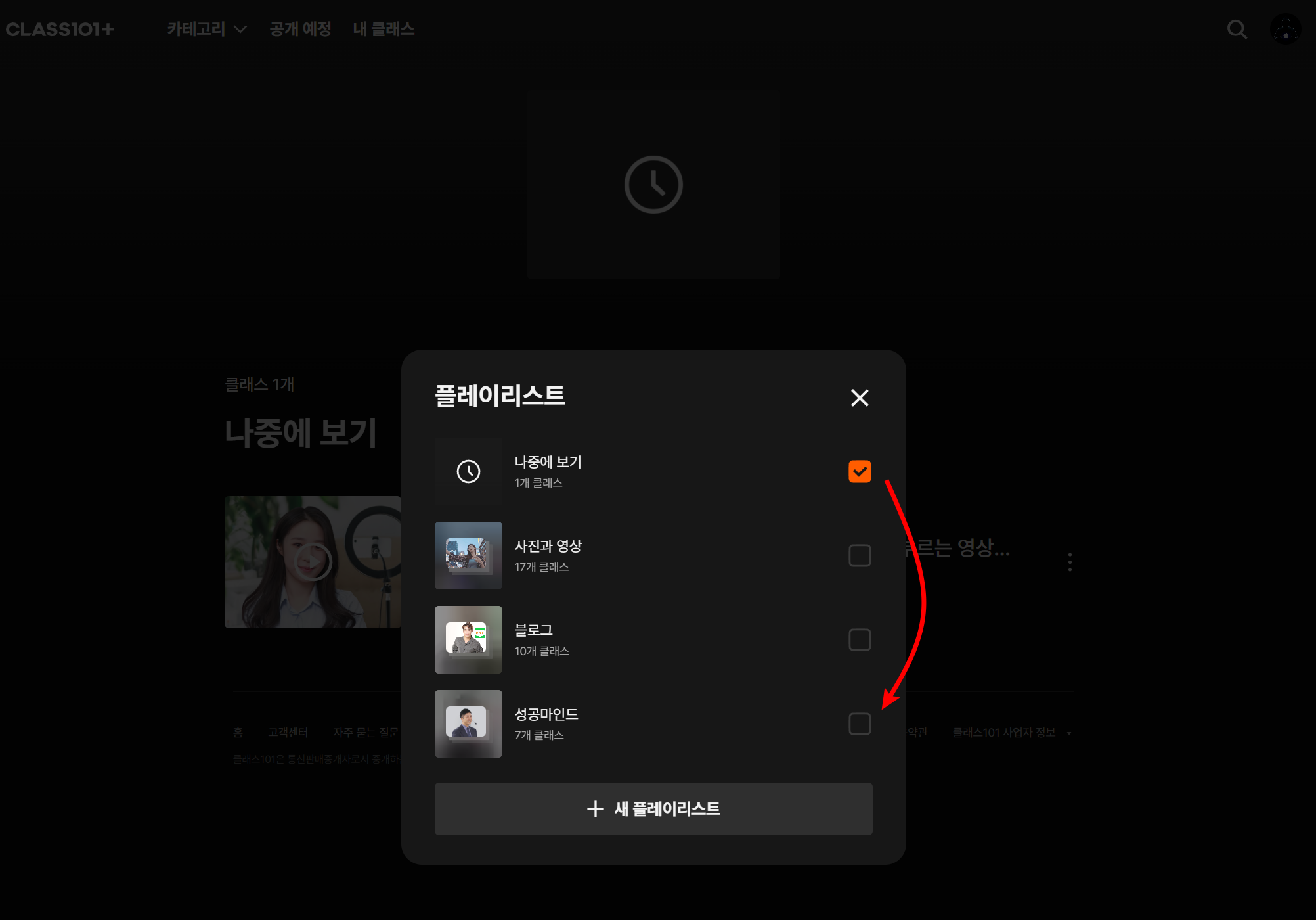 강의들을 즐겨찾기 하면 첫 번째로 '나중에 보기' 폴더 안에 다 모이게 됩니다. 바로 카테고리 분류를 할 수 없는 부분은 좀 아쉽네요. 그리고 점 3개 있는 곳을 클릭하면 위와 같이 리스트가 나옵니다. 빨간색 체크 한 것을 보시면 다른 플레이리스트를 만들 수 있는 것을 확인할 수 있습니다.