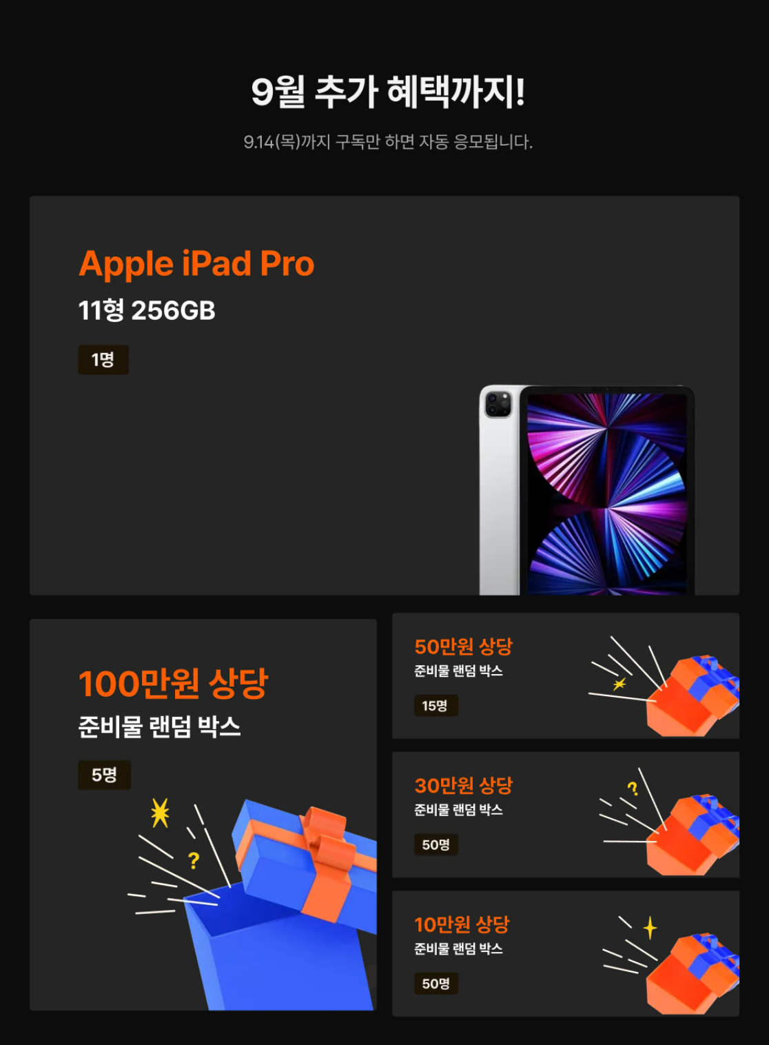 관심이 있으신 분은 9.14(목)까지 하는 이벤트를 노려보시는 것도 좋을 거 같습니다. 만약에 제 글을 보고 가입하신 분이 계시다면 꼭!! 이벤트에 당첨되실 겁니다. 아마도??