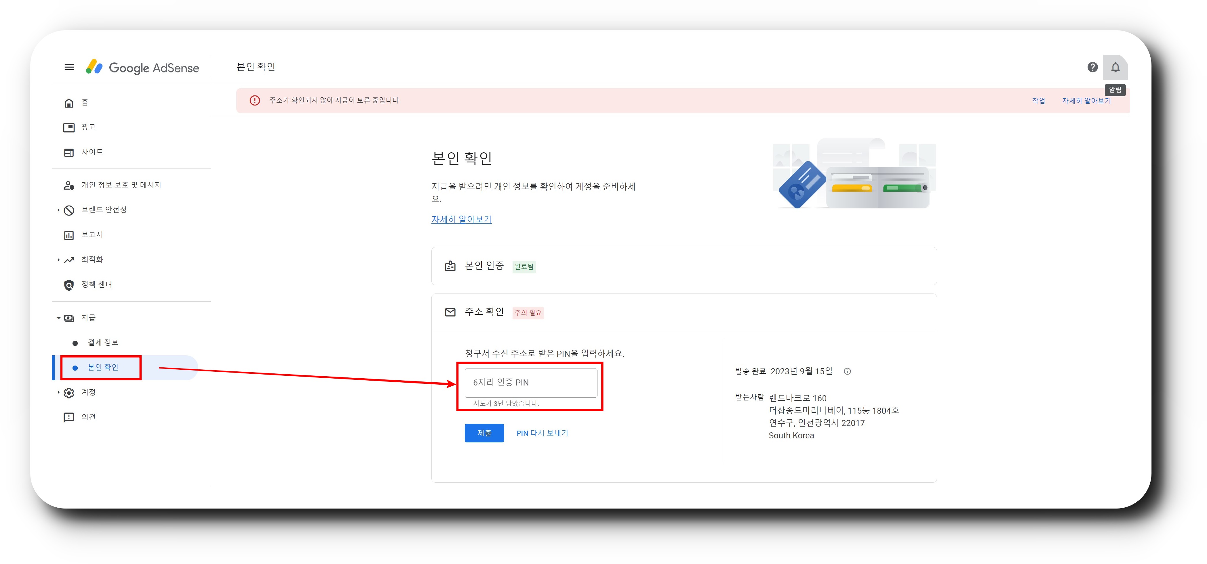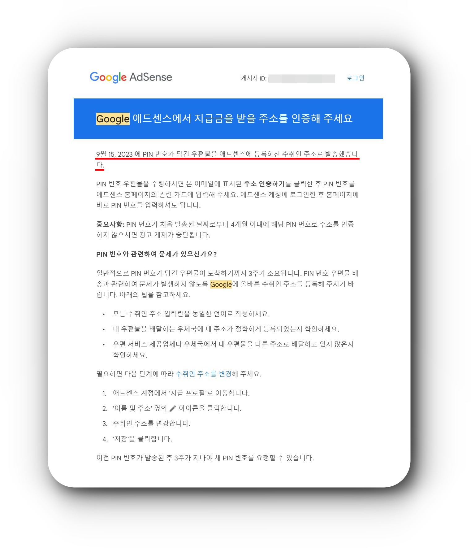 중요사항으로는 PIN 번호가 처음 발송된 날짜로부터 4개월 이내에 해당 PIN 번호로 주소를 인증하지 않으면 광고 게재가 중단이 된다고 하니 꼭!! 4개월 이내에 인증해 주세요.