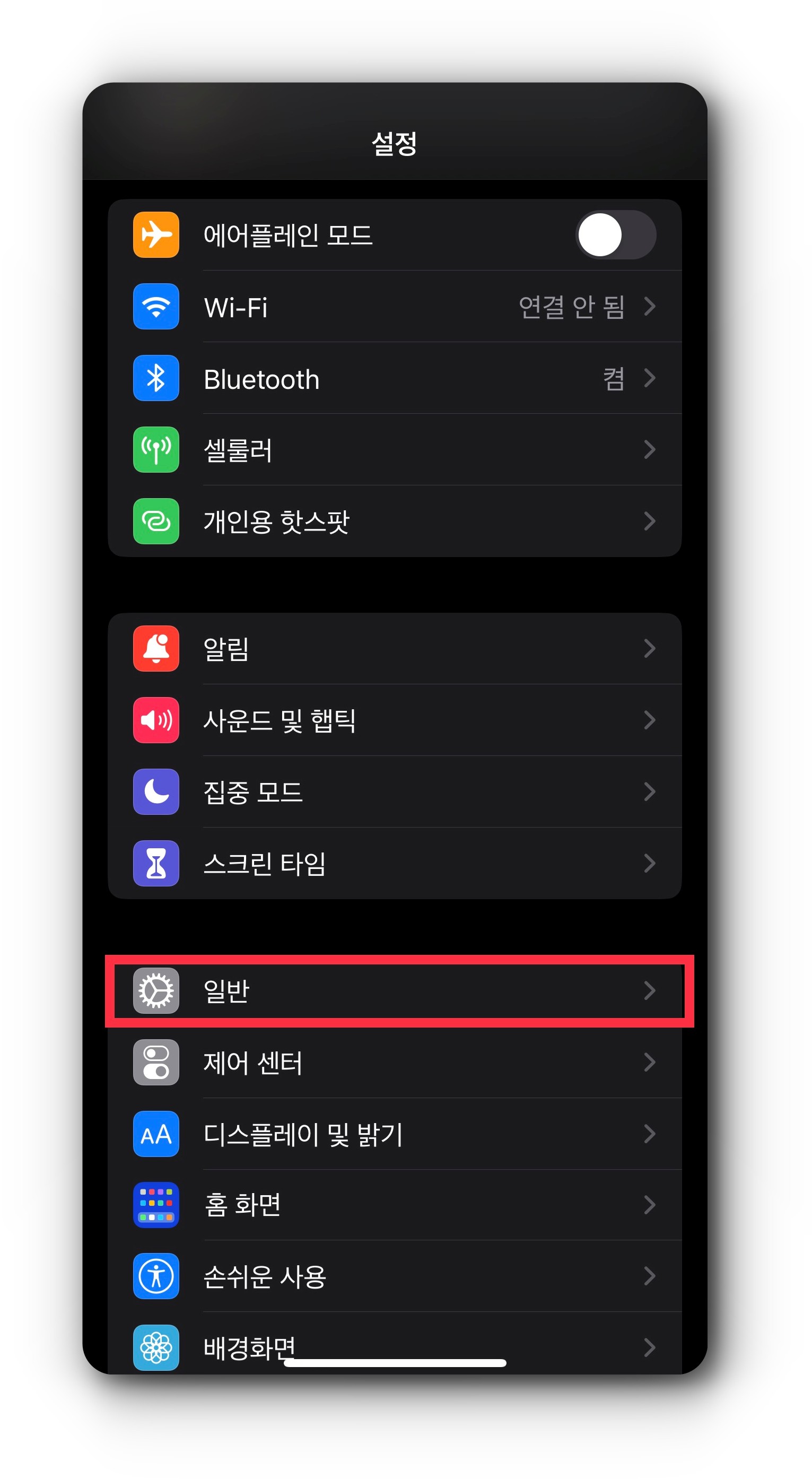 아이폰의 설정을 클릭하시고 일반 아이콘을 클릭하세요