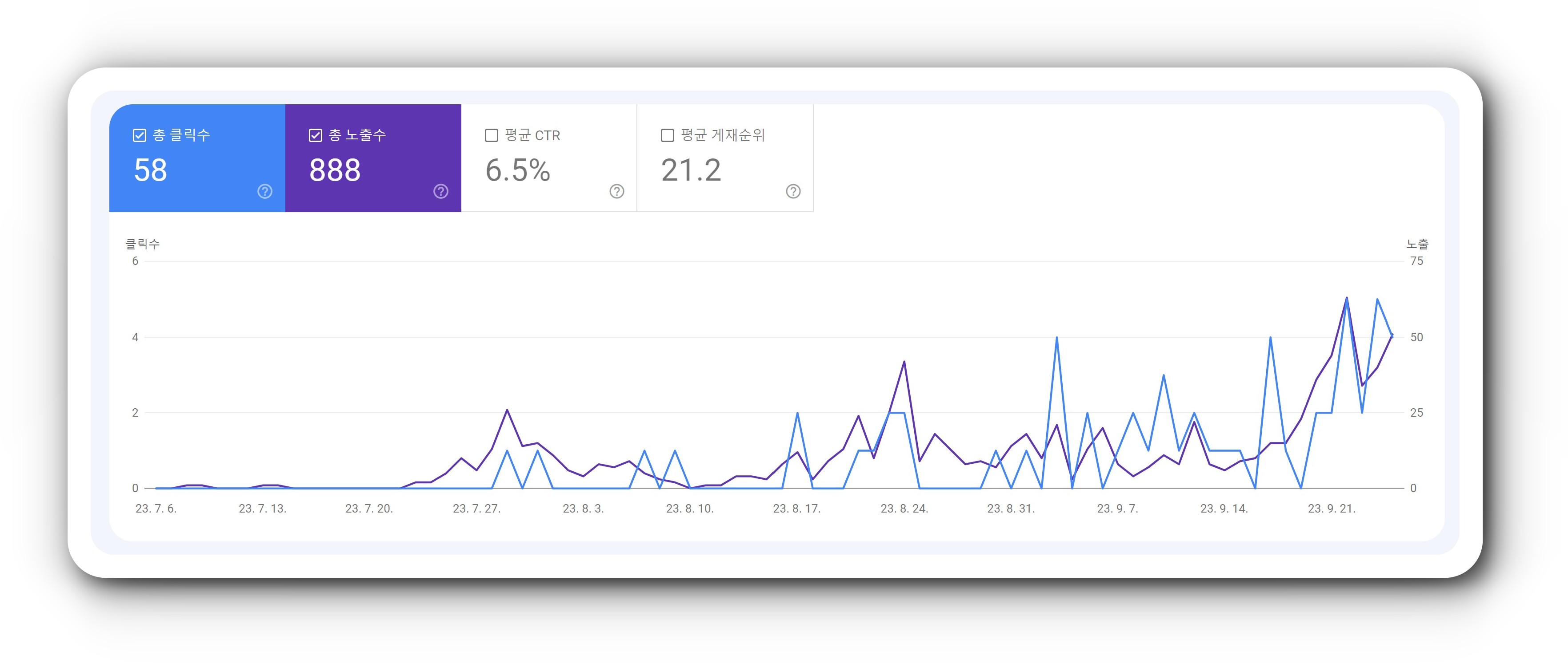 하지만, 제 글이 구글에 조금씩 노출이 되는 것을 확인할 수 있었는데, 노출 대비 클릭률이 낮긴 하지만 키워드를 구글에 검색했을 때 상위에 올라와 있는 것을 보니 좀 신기하기도 했습니다.