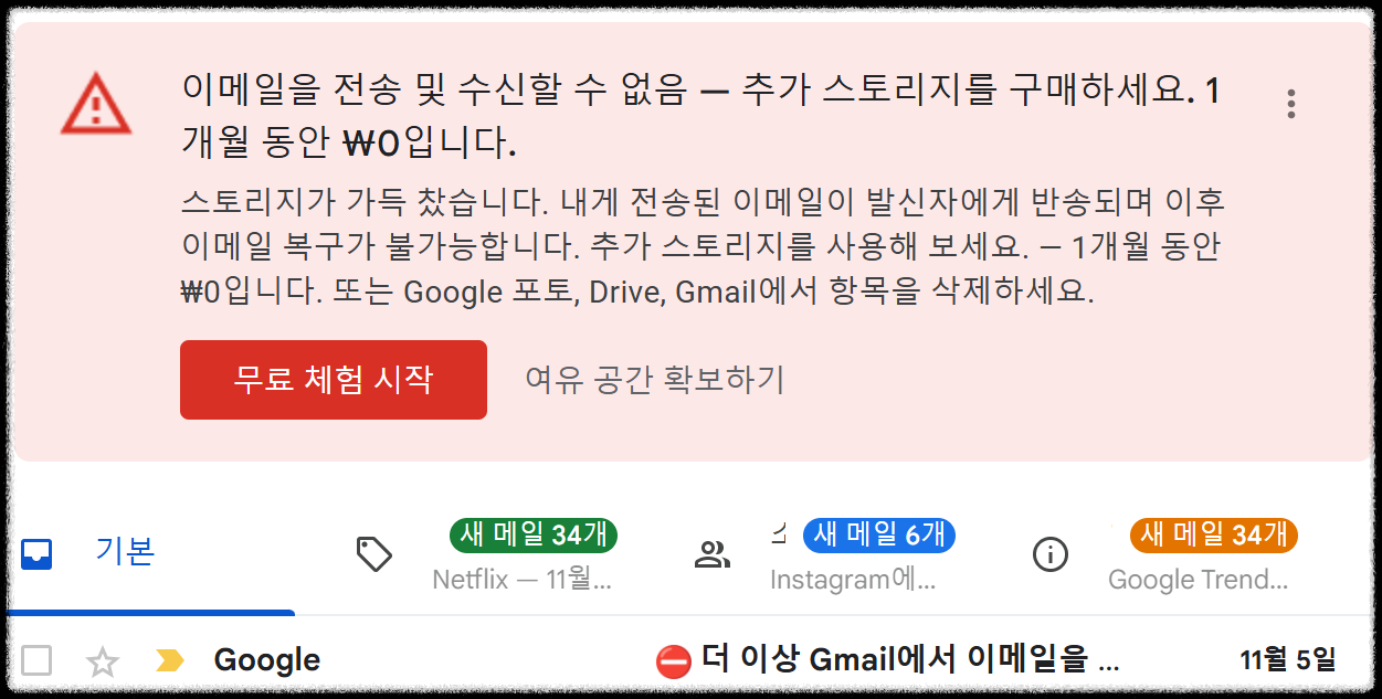 용량이 꽉 차게 되면 구글 메일도 받을 수가 없기 때문에 필수로 용량의 여유 공간을 늘리거나 불필요한 파일을 정리를 해줘야 해요.