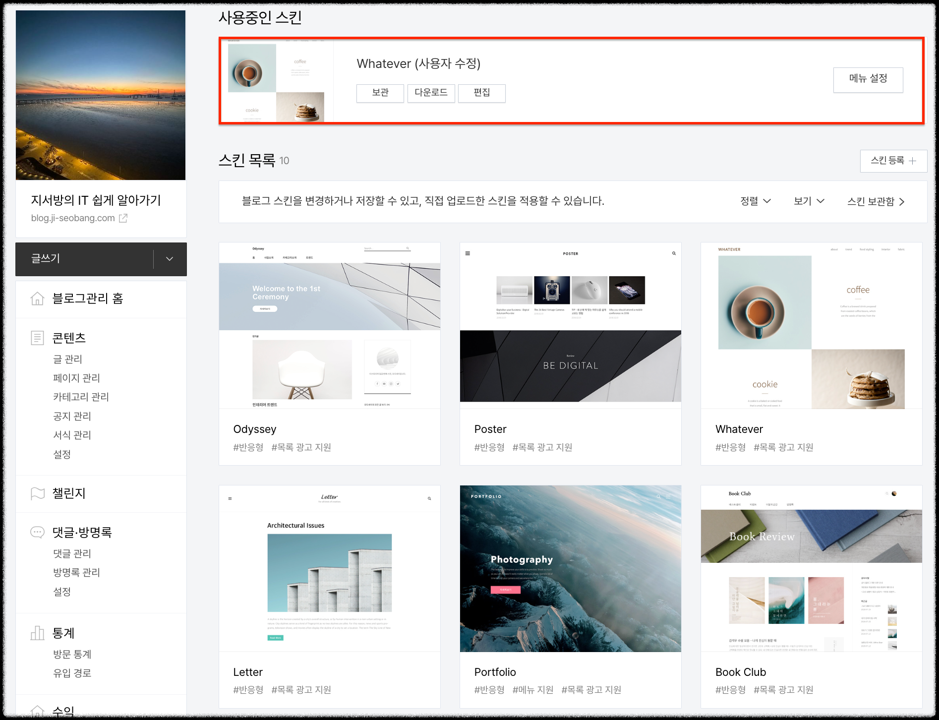 티스토리 블로그 스킨 변경을 하기 위해서 어떤 스킨이 있는지 확인을 해봐야겠죠? 기본 스킨은 총 10가지가 있어요.